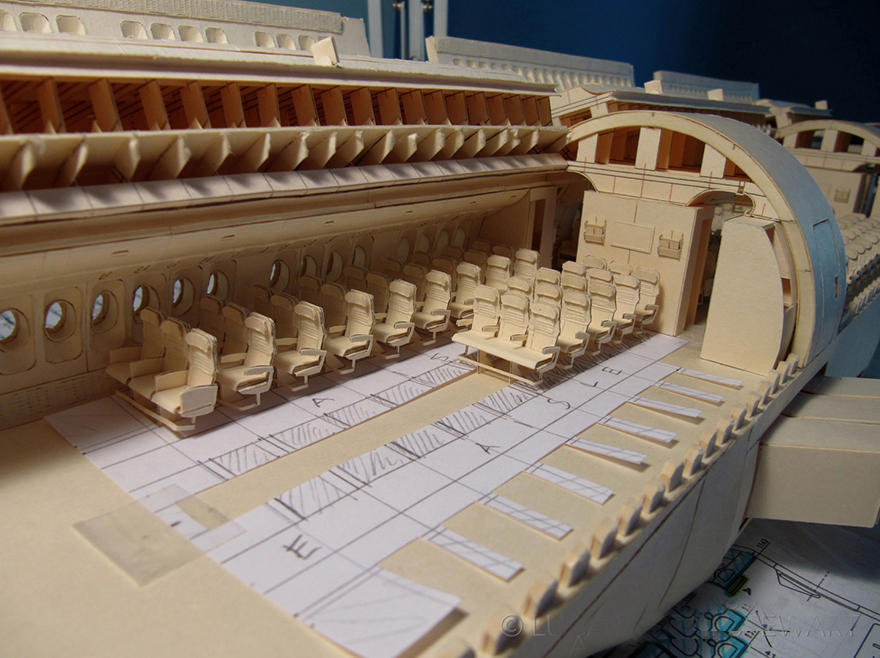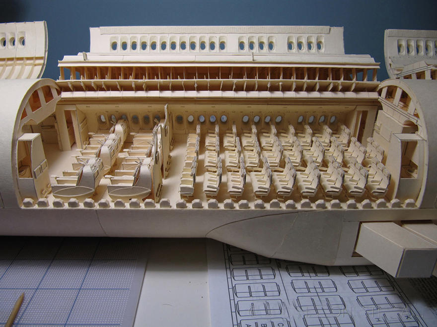 這架飛機(jī)模型,是一位藝術(shù)家花9年時間,按照波音777原型機(jī)60:1,用紙折出來的飛機(jī)模型。現(xiàn)在還沒有完工,但飛機(jī)模型讓見到的人都稱贊“天才之作”。